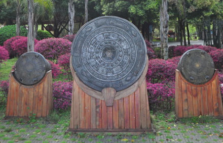 鑄銅鼓要先祭神,有時(shí)甚至用人祭。古代,銅鼓多用于祭神、節(jié)日喜慶,打仗時(shí),則是號令士兵的指揮工具。全球現(xiàn)有古銅鼓1600多個(gè),中國有1400多個(gè),其中廣西出土的獨(dú)占500多個(gè)。廣西博物館現(xiàn)藏有世界最大的銅鼓,鼓面直徑165厘米,鼓高67.5厘米,重約300公斤,被稱為“銅鼓王”。