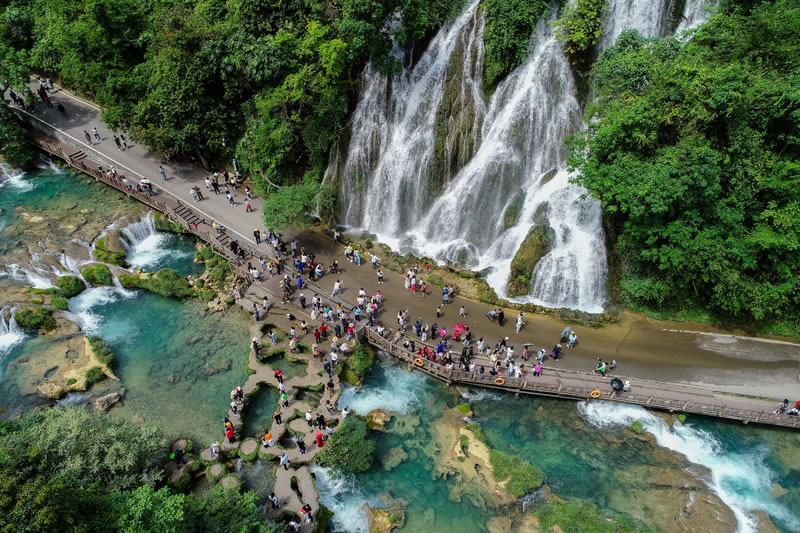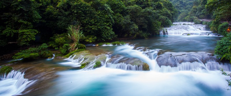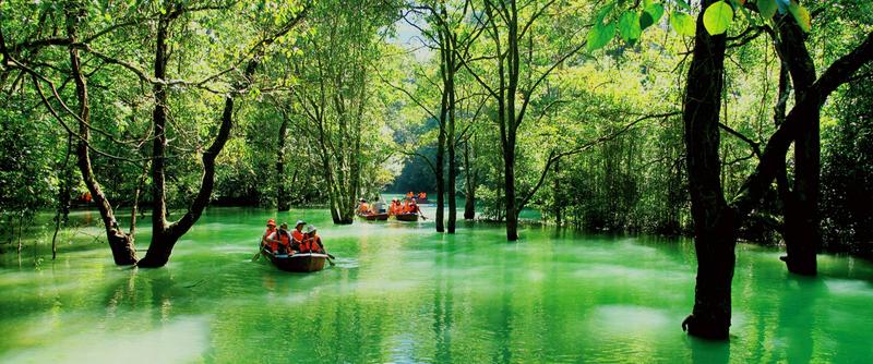 水上森林,長(zhǎng)約600米,分上下兩段。河谷里叢生著茂密的喬木和灌木,形成一道翡翠屏障。清澈的河水從河床的雜木林中穿涌而下。年復(fù)一年,日復(fù)一日的沖涮,河床已沒(méi)有了一粒泥沙,連磐石也被激流磨光了棱角而變得“圓滑”,樹(shù)木卻扎根在河床里,紋絲不動(dòng),四季常青。是“水在石上淌,樹(shù)在水中長(zhǎng)”的奇景。