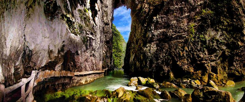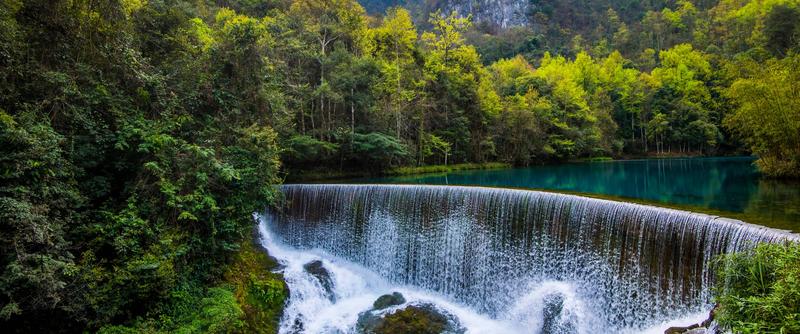 鴛鴦湖是小七孔一奇景,湖水如油,碧綠而凝重。因湖中有兩棵并排參天的大樹(shù)而得名,這兩棵大樹(shù)半截在水中,枝葉則在上方交握,雌樹(shù)纖巧,雄樹(shù)則兩三人才能環(huán)抱過(guò)來(lái),雄壯挺拔。湖面幽靜,水道四通八達(dá)。