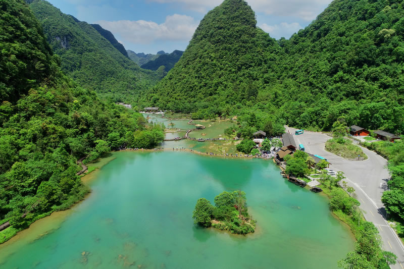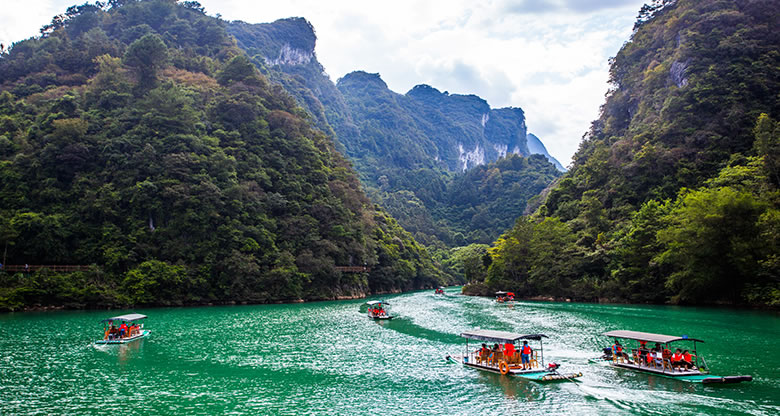 乘橡皮舟順?biāo)従彾,兩岸是蔥茸秀麗的喀斯特原始植被,幽靜的河水中,時(shí)而有魚(yú)兒躍起,時(shí)而有秀美島嶼出現(xiàn),宛如精巧的天然盆景。山水含情天做媒,帶著情侶竊竊私語(yǔ),帶著老伴同舟共濟(jì),帶著朋友戲水歡歌。
