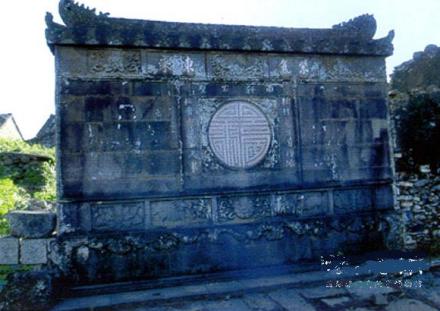 塊石砌成,高270 厘米、寬440 厘米、厚30 厘米;壁里外四周塑花紋圖案,雕雙鹿銜靈芝草;里外各陰刻“紫氣東來”、“福星高照”在其上端正中;中央篆刻“壽”字。房屋俱剩斷壁殘墻,唯照壁及中庭地板尚存完好。