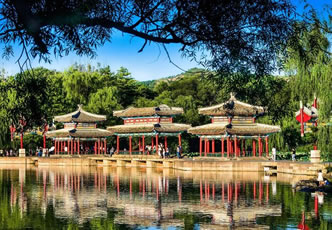 山巒區(qū):位于山莊西北部,面積443.5萬平方米。山區(qū)占了整個園林面積的五分之四。從西北部高峰到東南部湖沼、平原地帶,相對高差180米,形成了群峰環(huán)繞、色壑縱橫的景,山谷中清泉涌流,密林幽深。高聳的山峰好似天然屏障,阻擋了西北寒風(fēng)的侵襲,是調(diào)節(jié)山莊氣候的重要因素。當(dāng)年利用山峰、山崖、山麓、山澗等地形,修建了多處園林、寺廟,共計40余處。