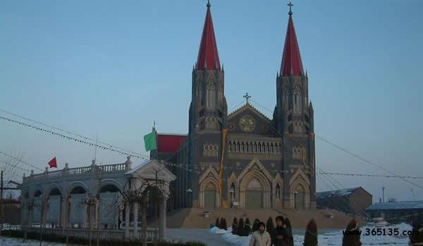 張莊天主教堂,歷史久遠(yuǎn),建筑宏偉,風(fēng)格別具,中外馳名,有“華北第一堂”之稱。此堂位于縣城東張莊村,分東西兩個(gè)大院,占地共315畝。據(jù)歷史資料記載,公元1856年(清咸豐六年)5月,羅馬教廷決定從法國(guó)遣使會(huì)管理的北京教區(qū)劃一部分歸法國(guó)耶穌會(huì)管理,在河北東南部成立一個(gè)新教區(qū),叫直隸東南教區(qū),并委任上海教區(qū)法國(guó)耶穌會(huì)會(huì)士朗懷仁為第一任代牧主教。1861年3月,朗懷仁主教決定將直隸東南教區(qū)首府遷至獻(xiàn)縣,選定城東一公里處的張家莊(現(xiàn)張莊村)建立總堂,該教區(qū)位于東經(jīng)111度至115度,北緯35度至39度之間,它的北部和東北部是北京教區(qū),西部是直隸西南教區(qū),南部是山東教區(qū),南北約520公里,東西約120公里轄河間、大名、廣平三府,深、冀、景、開(kāi)、磁五州及三十三個(gè)縣城及屬地教務(wù)。