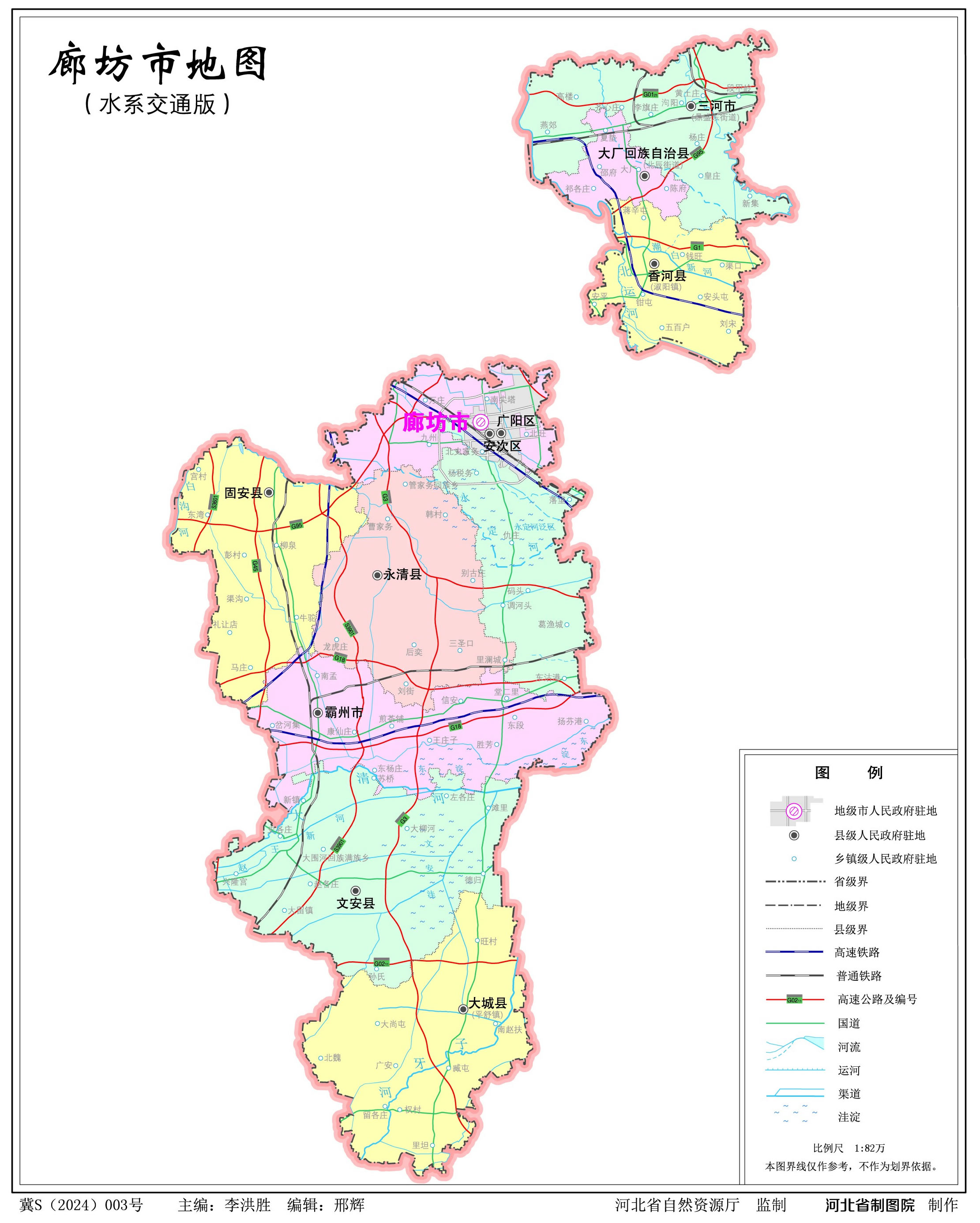 廊坊市轄2個(gè)市轄區(qū)、5個(gè)縣、1個(gè)自治縣,代管2個(gè)縣級(jí)市: