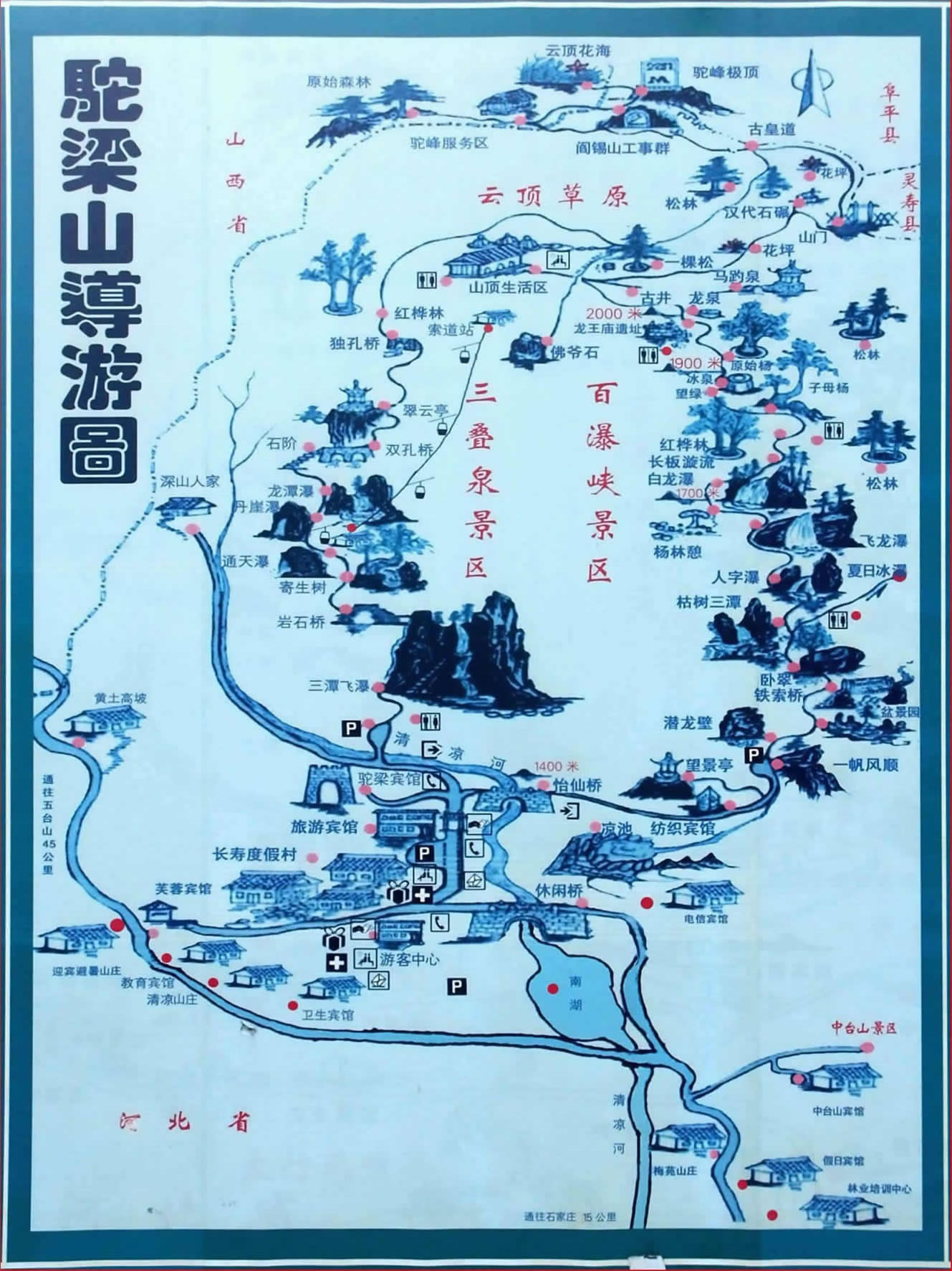 駝梁自然風(fēng)景區(qū)位于河北省平山縣西北部,東距省會(huì)石家莊市150公里,西距佛教圣地五臺(tái)山45公里,北起駝頂,南至四道溝(又稱南溝),長5公里;東自峰脊,西至山西省界,寬約4公里,總面積為22平方公里,主峰海拔2281米,是平山、阜平、山西五臺(tái)三縣的分水嶺,為河北省五大高峰之一,在當(dāng)?shù)乇环Q為“小泰山”,素有“省會(huì)屋脊”之稱。駝梁之名,是因山頂兩峰此起彼伏,形如駱駝峰脊而得。山體屬典型的變質(zhì)巖地貌結(jié)構(gòu)。以奇、秀、高、遠(yuǎn)聳立于巍巍太行,更以涼、幽、靜、野而馳名華北,久享“太行綠寶石”美譽(yù)。由四道溝入山,沿碎石路蜿蜒而上,兩側(cè)青山聳立,怪石磷峋,松生崖,虬藤攀緩,路邊流水撫石,樹間小鳥鳴唱,好一派風(fēng)光。