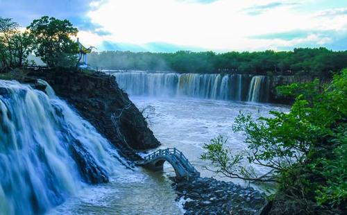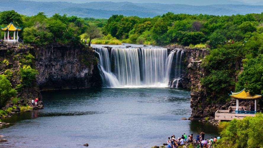 吊水樓瀑布位于鏡泊湖北頭。是景區(qū)的特級自然景源(世界級),酷似聞名世界的“尼亞加拉大瀑布”。平水期時(shí),瀑布一般幅寬五六十米,落差十二米。但在汛期,最高落差僅十余米,瀑布最大幅寬可達(dá)四百余米,從南、西、北三個(gè)方向以排山倒海之勢從熔巖壁頂直撲黑龍?zhí)。似浮云堆雪,白霧四濺,百米之外,水珠鋪面;又似銀河倒掛,彩練懸崖,奔騰咆哮,聲如奔雷。與貴洲的黃果樹瀑布、黃河壺口瀑布、九寨溝諾日朗瀑布、臺(tái)灣的文龍瀑布、廬山的三疊泉瀑布并稱中國六大名瀑。