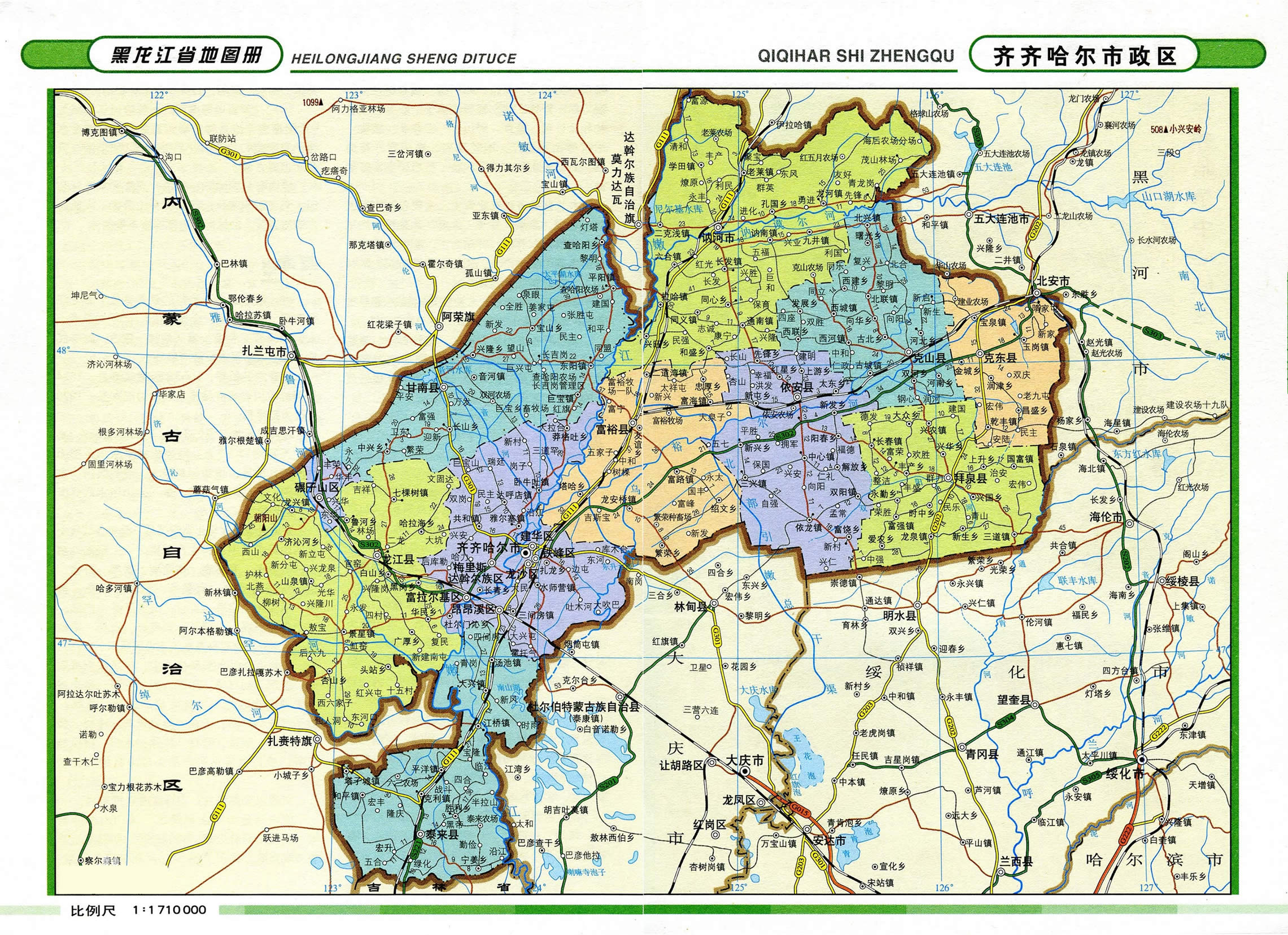 龍江縣 面積6175平方千米,人口414285,政府駐龍江鎮(zhèn),下轄8個(gè)鎮(zhèn)、6個(gè)鄉(xiāng)