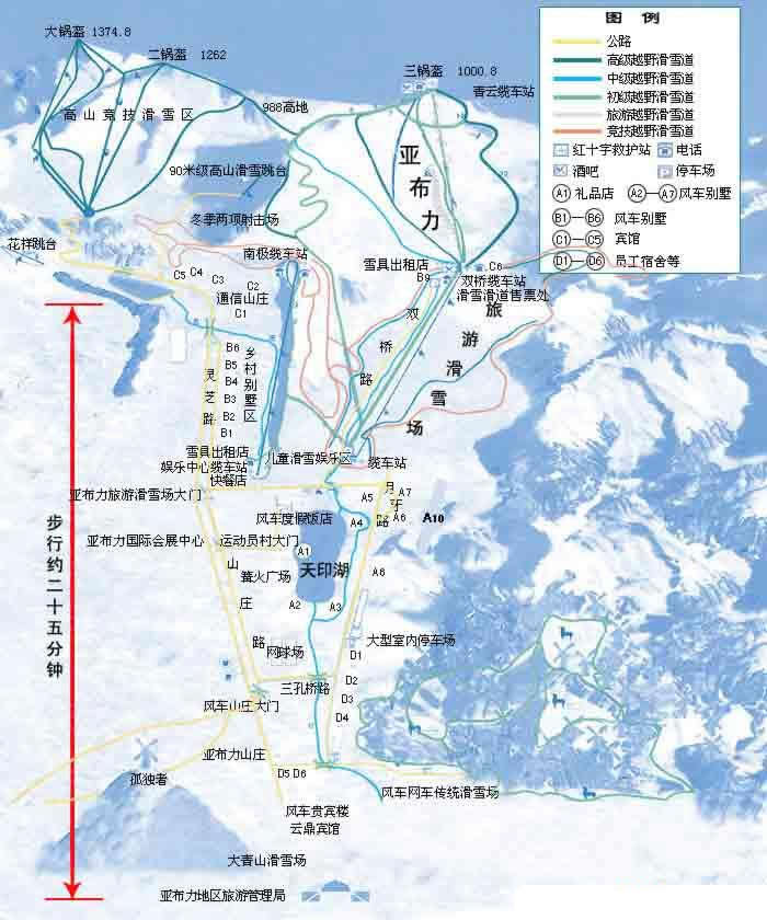 亞布力滑雪旅游度假區(qū)由具有國際標(biāo)準(zhǔn)的高山競(jìng)技滑雪區(qū)和旅游滑雪區(qū)兩大部分組成,占地面積22.55平方公里。在大鍋盔(海拔1374米)、二鍋盔(海拔1262米)和二鍋盔與三鍋盔之間的海拔988米高地處修建了具有國際標(biāo)準(zhǔn)的高山競(jìng)技滑雪場(chǎng),有9條高山滑雪道,7條越野滑雪道,6條滑雪纜車和花樣跳臺(tái),90米級(jí)高山跳臺(tái),冬季兩項(xiàng)靶場(chǎng)及室內(nèi)體育館、運(yùn)動(dòng)員村等場(chǎng)地。在三鍋盔(海拔1000.8米)建成了大型旅游滑雪場(chǎng),擁有l(wèi)l條高、中、初級(jí)滑雪道,總長(zhǎng)度30公里,其中有長(zhǎng)5公里的5號(hào)雪道,l條5公里長(zhǎng)的環(huán)形越野滑道,2公里長(zhǎng)的全墊升氣墊船、雪地草地摩托及雪橇專用道,3條雙人吊椅式旅游纜車索道和3條拖牽式旅游索道。