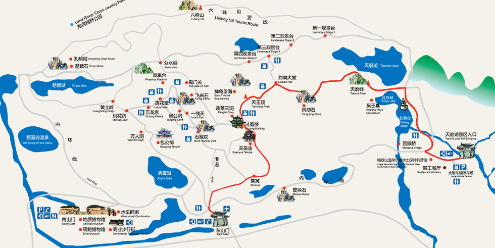 南山,位于嵖岈山南端,從南山拾階而上,主要景點有雙猴望月、秀蜜湖、蜜蠟峰、吳公亭、嵖岈大仙、黑風(fēng)洞、包公祠、桃花洞、動物石界、通天神龜、海獅石、青蛙望天、二道門、野榔榆、戰(zhàn)爭與和平、五龍宮、西游記雕塑園、千孔柏、百步梯、滑道、鳳凰臺、老君花園峰、乾隆床、飛來石、壽星石、吳公洞、一線天、中華盆景園、石猴、母子石、吊橋等。