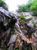六疊瀑布中以第三級形似蓮花洞穴的蓮花瀑、第四級猶如飛珠濺玉的飛玉瀑及第五級恰象仙女洗浴的浴女瀑最為奇特壯觀。六疊瀑之下,有神龜潭。右側(cè)絕壁為仙掌峰,節(jié)慶之日,常有鑼鼓叮當之聲。