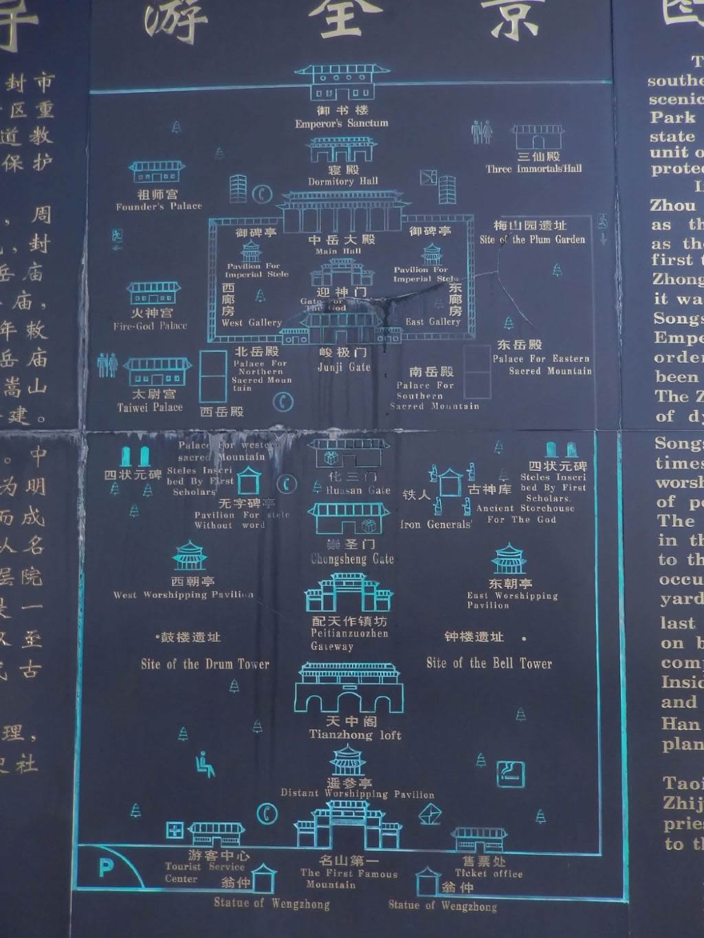 峻極門外臺(tái)階下東側(cè),有一座《五岳真形圖碑》,刻立于明萬歷三十二年(1604年),碑上按照五岳的座落方位,雕刻著五岳圖,圖下刻記著關(guān)于五岳的傳說!段逶勒嫘螆D》是根據(jù)“華山如立、泰山如坐、北岳如行、南岳如飛、中岳如臥”等不同特點(diǎn)繪制的代表五岳的象形碑。