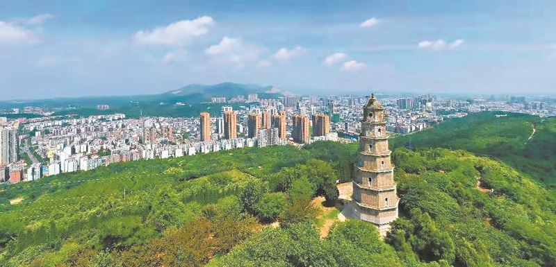 白云樓省級文物保護單位。坐落在荊門城區(qū)青龍山西麓,東高西低,呈多級臺階狀,占地面積近2萬平方米,中軸線上依次排列著山門、臥云洞、斯臺、白云樓、三皇殿、純陽殿,南北兩側(cè)建配殿、招鶴亭、碑廊、鐘鼓樓等建筑。