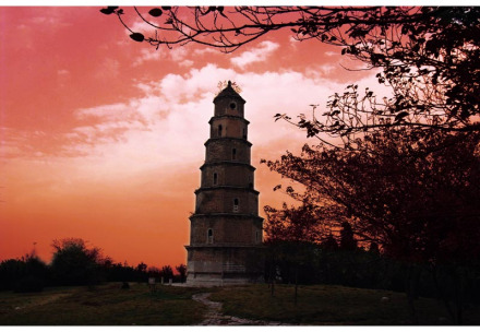 東寶塔是荊門今存的唯一一處具有千年歷史的地面文物,建于隋開皇十三年(公元593年)。寶塔通高33.3米,底部周長30.6米,七層四面八角,隔面設(shè)窗,攢尖式塔頂。塔基座周長31.2米,高0.76米。基座之上都有石須彌座,須彌座八角各雕一尊托塔金剛。底層門楣有石刻“長林頭角”四字,自底層有螺旋狀青石階梯上塔頂(海拔260米)。