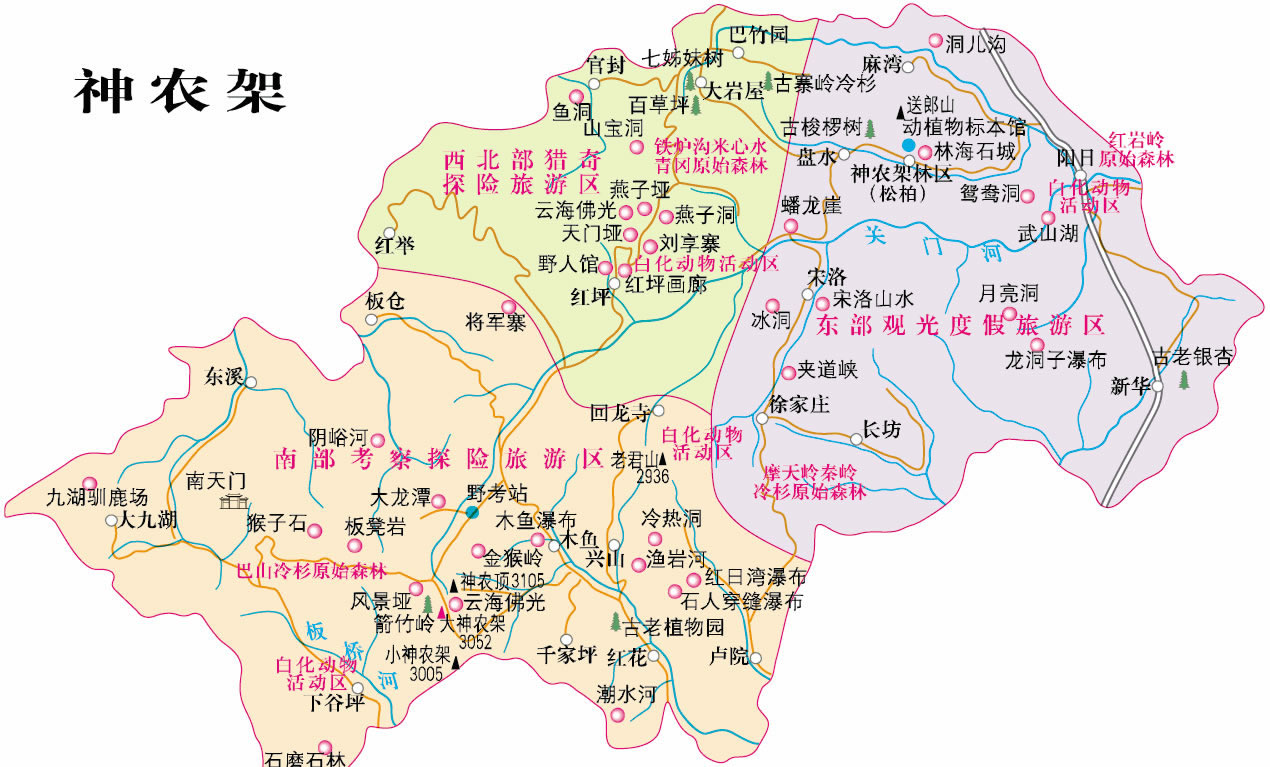 神農(nóng)架是我國(guó)內(nèi)陸保存完好的唯一一片綠洲和世界中緯度地區(qū)唯一的一塊綠色寶地。它所擁有的在當(dāng)今世界中緯度地區(qū)唯一保持完好的亞熱帶森林生態(tài)系統(tǒng),是最富特色的壟斷性的世界級(jí)旅游資源,動(dòng)植物區(qū)系成分豐富多彩,古老、特有而且珍稀。蒼勁挺拔的冷杉、古樸郁香的巖柏、雍容華貴的梭羅、風(fēng)度翩翩的珙桐、獨(dú)占一方的鐵堅(jiān)杉,枝繁葉茂,遮天蔽日;金絲猴、白熊、蘇門(mén)羚、大鯢以及白鸛、白鶴、金雕等走獸飛禽出沒(méi)草叢,翔天林間。一切是那樣地和諧寧?kù)o,自在安詳。這里還有著優(yōu)美而古老的傳說(shuō)和古樸而神秘的民風(fēng)民俗,人與自然其同構(gòu)成我國(guó)內(nèi)地的高山原始生態(tài)文化圈。神農(nóng)氏嘗草采藥的傳說(shuō)、“野人”之謎、漢民族神話史詩(shī)《黑暗傳》、川鄂古鹽道、土家婚俗、山鄉(xiāng)情韻都具有令人神往的誘惑力。這里山峰瑰麗,清泉甘冽,風(fēng)景絕妙。神農(nóng)頂雄踞“華中第一峰”,風(fēng)景埡名躋“神農(nóng)第一景”;紅坪峽谷、關(guān)門(mén)河峽谷、夾道河峽谷、野馬河峽谷雄偉壯觀;陰峪河、沿渡河、香溪河、大九湖風(fēng)光綺麗;萬(wàn)燕棲息的燕子洞、時(shí)冷時(shí)熱的冷熱洞、盛夏冰封的冰洞、一天三潮的潮水洞、雷響出魚(yú)的錢魚(yú)洞令人叫絕;流泉飛瀑、云海佛光皆為大觀!