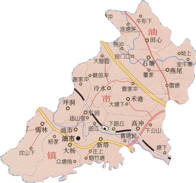 油市鎮(zhèn)行政區(qū)劃圖 油市鎮(zhèn)位于永興縣西部,東與湘陰渡鎮(zhèn)交界,海拔高度:123米。西與高亭、洋塘鄉(xiāng)毗鄰,北與復(fù)和鄉(xiāng)相連,南與蘇仙區(qū)廖王坪鄉(xiāng)接壤。 油市鎮(zhèn)下轄儒林、大揚(yáng)、油市、坪洞、車田、冷水、新塔、高沖、禾巷、石塘、田心、燕尾12個行政村和1個居委會,人口29021人,總面積為42.6平方公里。京廣鐵路、京珠高速、107國道、S212省道貫穿全鎮(zhèn),交通十分便利。 |
