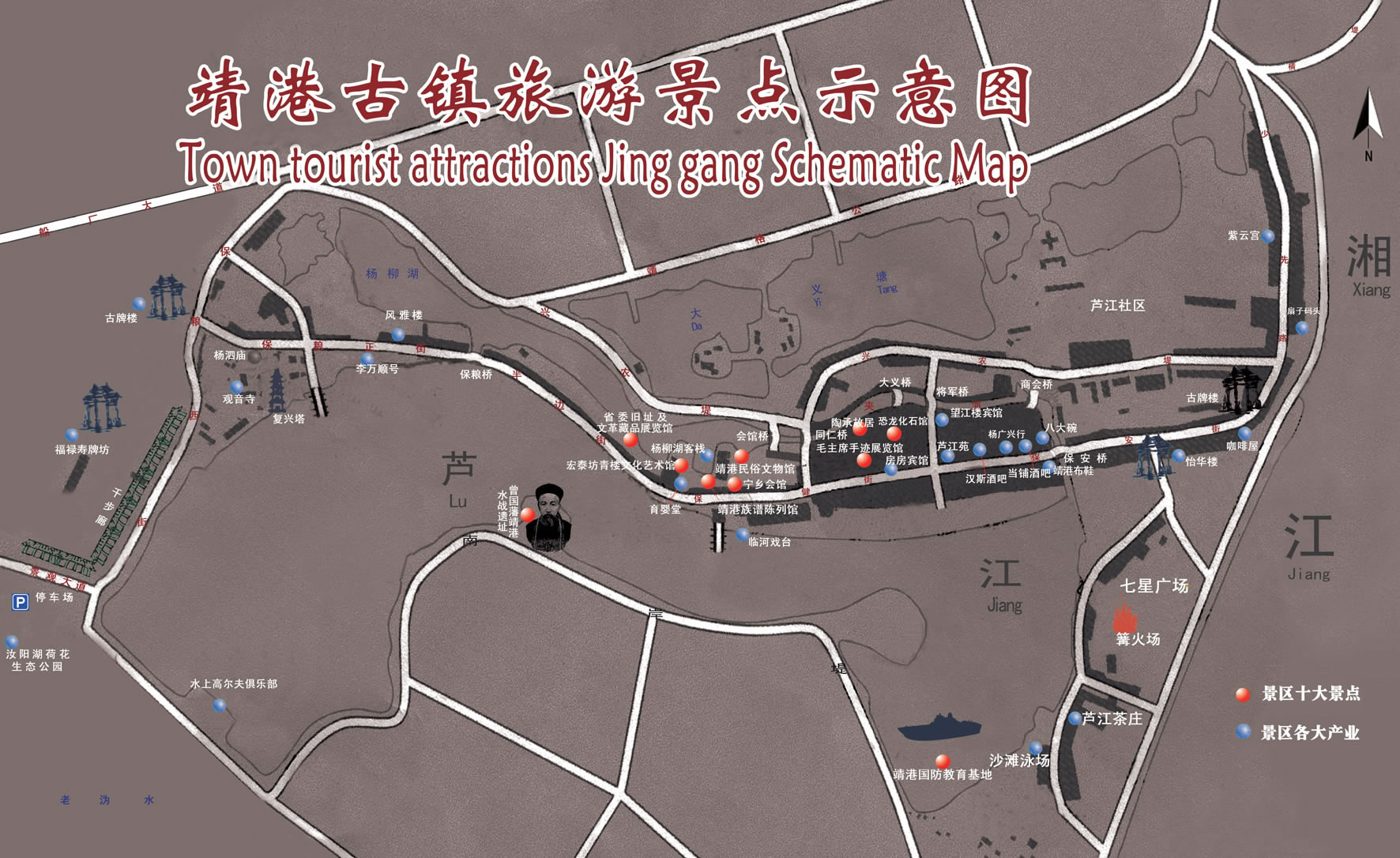 2、由長(zhǎng)沙經(jīng)金星大道或雷鋒大道至望城,過(guò)溈水大橋后右沿湘江大堤北行9公里到達(dá)靖港古鎮(zhèn)東入口“七星廣場(chǎng)”。 |