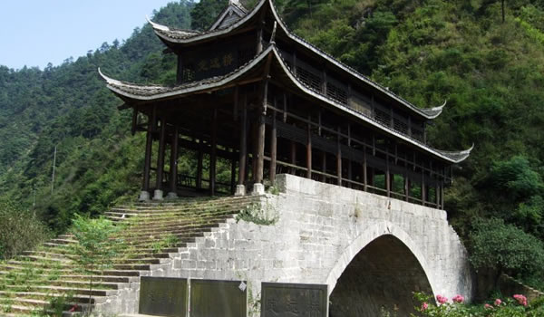 定遠橋 定遠橋位于綏寧縣關(guān)峽鄉(xiāng),是綏寧縣知縣范成龍捐獻自己的俸祿銀子于康熙二十三年(1684年)修建。橋長一十二丈六尺,寬二丈六尺,高五丈六尺,單孔,半圓拱。橋面用青石鋪面,青石已被磨得油亮發(fā)光,橋頂屋架木瓜、懔條緣皮、青瓦翹檐、瓦頭潔白,橋依山而建,古樸威嚴;亭為杉木架構(gòu),卯榫嵌合,不用一釘,圓石為礎(chǔ),巨木為柱,片板為欄,長方為座,可供憩息,可避風(fēng)雨。由于這里的險關(guān)隘口天然生成,為歷代兵家要塞,故名關(guān)峽;現(xiàn)為湖南省保護文物; 橋下的“蘭溪”溪水清澈見底,水流湍急,水似一把利刃,把猴子山一劈兩開穿山而過。 |