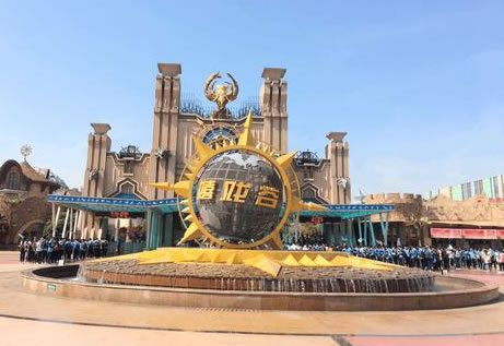 夢(mèng)幻廣場(chǎng)上,色彩、音樂和諧律動(dòng),植被、裝飾色彩明麗。廣場(chǎng)中央,以金屬打造而成的“環(huán)球動(dòng)漫嬉戲谷”大型球體標(biāo)志金光璀璨,以360度的環(huán)形軌跡勻速運(yùn)轉(zhuǎn),昭示著永恒延續(xù)的創(chuàng)新精神。正對(duì)廣場(chǎng),“ 英雄門” 雄偉高聳, “ 人” 、“神”、“獸”浮雕形象惟妙惟肖,氣勢(shì)威武。在英雄門的左右兩側(cè),分別設(shè)有兩棟輔建筑,右側(cè)為售票大廳及VIP貴賓休息區(qū),左側(cè)為游客出口區(qū),內(nèi)設(shè)置旅游紀(jì)念品及嬉戲谷主題衍生產(chǎn)品購(gòu)物區(qū)。穿過宏偉的英雄門,心跳里程正式開啟。