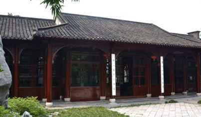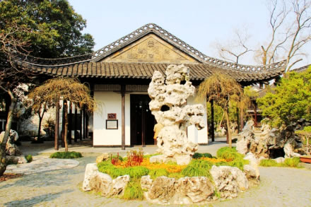 水池的北面是主人用于宴請(qǐng)賓客的宴廳,因廳角昂翹,像振翅欲飛的蝴蝶,故稱蝴蝶廳。廳內(nèi)木壁上刻著歷代名碑字畫。