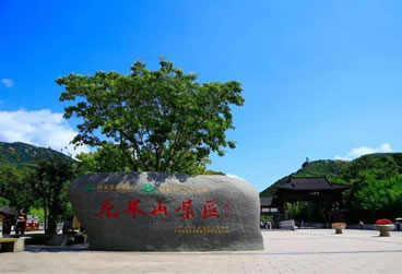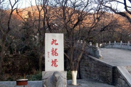 九龍橋是因為山上有九條山澗像九條舞動著的龍,從四面八方匯集于橋下而得名。那時候百姓都相信龍是神,一些香客就在此橋小憩一刻,來沾一點龍的壽氣,再進山求佛,保全家萬事平安,因此九龍橋又叫萬壽橋。傳說花果山上原來有十條龍,九條龍在山里面住著,為了防止外族侵犯,便派了一條本事最大的禿龍到東面的山頭守衛(wèi)。山東莊還有禿龍山,那龍山上還有兩個對穿的山泉就是傳說中的龍耳。我們可以在橋上往南望,那遠處的村莊便是山東莊。九龍橋畔有一棵千年老銀杏,粗大的枝椏已經(jīng)擠進了橋身,橋上橋下布滿樹蔭,給游客提供了休息納涼的理想場所。