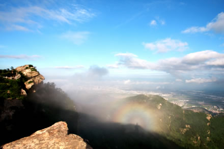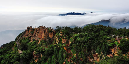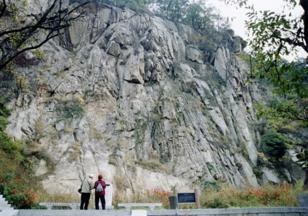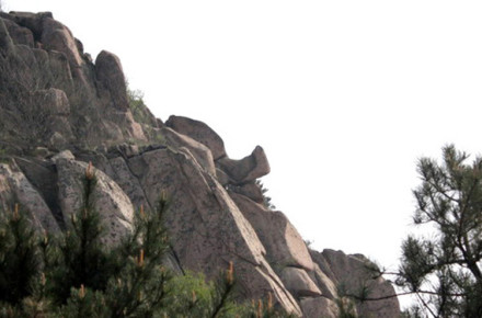 從遠處山腰眺望一線天,這里就是著名的八戒石.很像一個戴著僧帽的老豬在綠樹叢中呼呼大睡。一線天下面是花果山山名摩崖石刻,游客都愛在這里留影,青山紅字,非常壯麗。這里還有天然碑、硯石等景觀。沿小路前進可至墨香小徑,里面有百余位當(dāng)代書法名家的作品刻在天然石塊上;還可至怪石園,看千奇百怪與《西游記》有關(guān)的象形石!吧瘛弊滞踉跂|部禿龍溝下,是刻在山體上的懷素草書“神”字,長39.4米、寬15.8米,為世界上最大的單體漢字,1996年被載入吉尼斯世界紀(jì)錄。 登上玉女峰是花果山之游的高潮,有緣的人在這里可看到云臺山兩個最為精彩的景致。一個是在迎曙亭看海上日出;另一個是看云臺鋪海,白云翻滾好像海水揚波,露出來的峰頂就像大海里的蓬萊仙島,群山俯伏,阡陌縱橫,此情此景令人有飄飄欲仙的感覺。