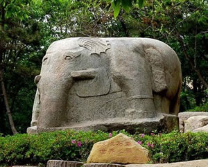 從龍洞西行,在林木掩映的山坡上.屹立著一座碩大的漢代圓雕石象。石象依一塊花崗巖巨石的自然形狀雕刻而成雕刻而成,象身高2.6米,長4.8米,背寬3.5米,石像耳闊體肥,四肢健壯,長鼻巨牙、卷尾粗足,形態(tài)雄奇,豐滿肥碩。象身西側有一高0.88米,寬0.49米,深0.2厘米的陰鑿凹面,系未見刻銘的題榜,象身東側以陰線刻一高1.13米,寬0.62米的方框,內刻隸書“象石”字樣,在刻銘與象前腿之間,還鑿刻了一個頭梳“丁”字形發(fā)髻,手持勾鞭,腳帶鐐銬高0.92米的馴象奴。象的四足均踏著蓮花,體現(xiàn)了佛教中六牙白象王在水中步步蓮花的故事傳說。它是孔望山漢代佛教造像有機整體中不可分割的一部分。此石系目前我國發(fā)現(xiàn)的東漢時期最大的圓雕石刻,石象南側約一百五十米處,還有與此同時期的石雕鎮(zhèn)海蛙,此蛙為當時鎮(zhèn)海之物。體長240厘米,寬220厘米,通高110厘米,石蛙頭部略損,前兩肢半殘,眼睛陰刻,背上遍刻陰線鱗紋。這兩座石雕,別特是石象,氣勢雄偉,造型精美。均為我國珍貴的石刻藝術珍品。
