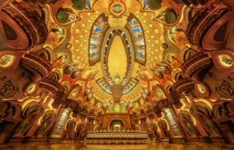 舍利藏宮又稱佛寶層,整體以暗色調(diào)為主,營造出莊重的氛圍。由三廳一廊、藏宮大殿(舍利寶幢、拼畫、四大菩薩)、參拜環(huán)廊三部分組成。這里既是珍藏佛祖頂骨舍利的神圣之地,又是信眾禮佛參拜、靜坐禪修的神秘空間。長廊長66米,根據(jù)六波羅密的供養(yǎng)內(nèi)涵,即持戒、布施、忍辱、精進(jìn)、禪定、智慧布局,分別是香供廳、燈供廳、水供廳以及花供長廊。