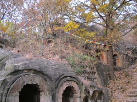 傳說,棲霞寺創(chuàng)建人僧紹曾夢(mèng)見西巖壁上有如來佛光,于是立志在此鑿造佛像;他病故后,其子在南齊永明二年(484年)開始與僧智度禪師在西壁上鑿佛龕,直到南朝齊永明七年(489年),三圣像才得以完成,三佛合稱“西方三圣”,該殿也稱“三圣殿”。南朝梁大同六年(540年)三圣像佛龕上出現(xiàn)佛光,驚動(dòng)齊梁貴族,于是紛紛前來鑿石造像。于是從南朝齊永明二年至梁天監(jiān)十年(484-511年)逐漸開鑿而成的佛像始有515尊,所有佛像或五六尊一龕,或七八尊一室,分鑿于294個(gè)佛龕中。后來,唐、宋、元、明各代相繼在紗帽峰都有開鑿,連南朝在內(nèi),共有700尊。佛像大者高數(shù)丈,小者僅盈尺,號(hào)稱千佛崖。 |