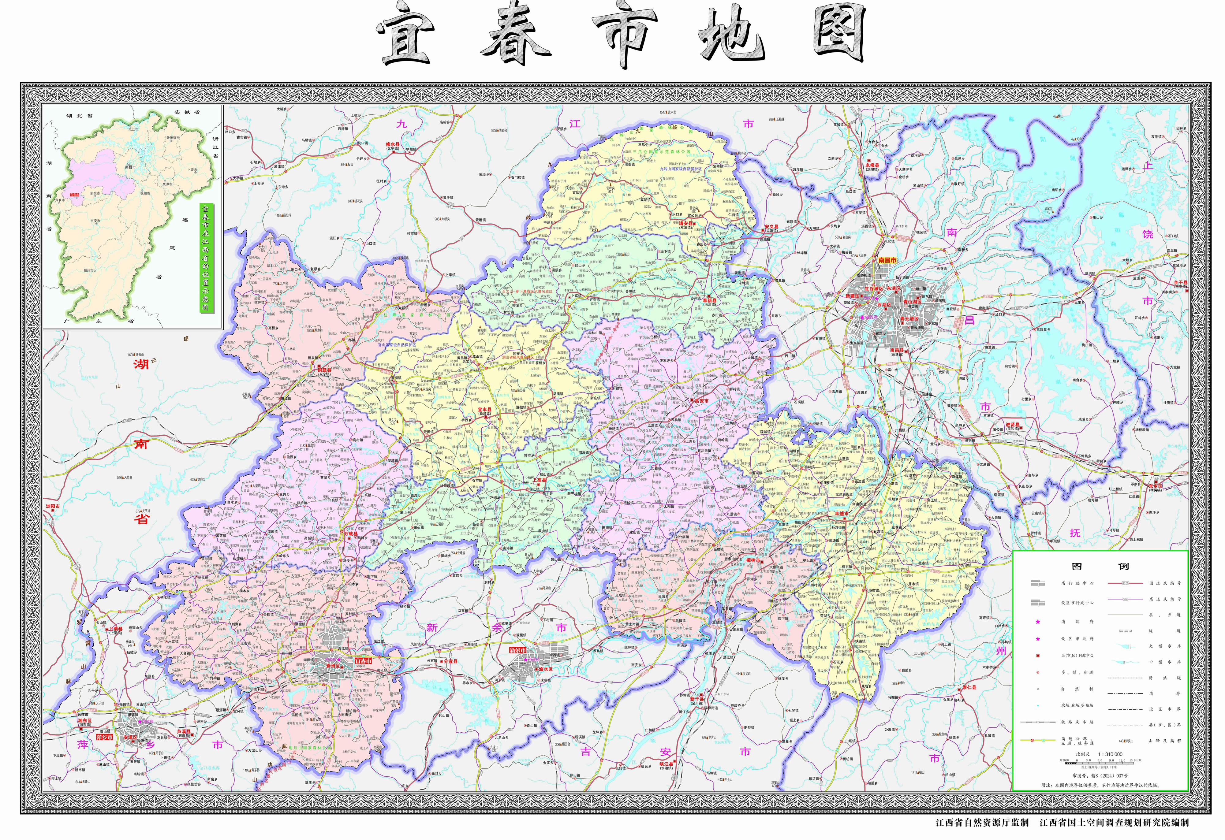 宜春市位于江西省西北部,東境與南昌市接界,東南與撫州市為鄰,南陲與吉安市及新余市毗連,西南與萍鄉(xiāng)市接壤,西北與湖南省的長沙市及岳陽市交界,北與九江市相鄰。境內(nèi)東西長約222.75千米,南北寬約174千米,總面積1.87萬平方千米。
