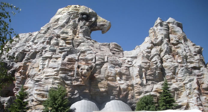 火山爆發(fā),位于長影世紀(jì)城北端,場景設(shè)計有瑪雅古城、溶巖、高山、火山洞口、驚雷、閃電、地震、山石滾動、城墻倒塌、龍卷風(fēng)等。