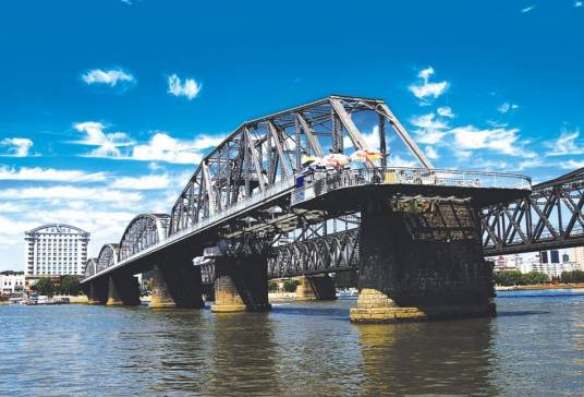 鴨綠江斷橋為鴨綠江上諸多橋中第一座橋,由日本朝鮮總督府鐵道局所建。1909年5月動工,1911年10月竣工。1950年11月,被美國空軍炸斷。戰(zhàn)后中方一側所剩四孔殘橋一直保留,被習慣上稱為“斷橋”,朝方一側則把所屬六孔和中方剩余兩孔殘橋拆除,僅存橋墩。