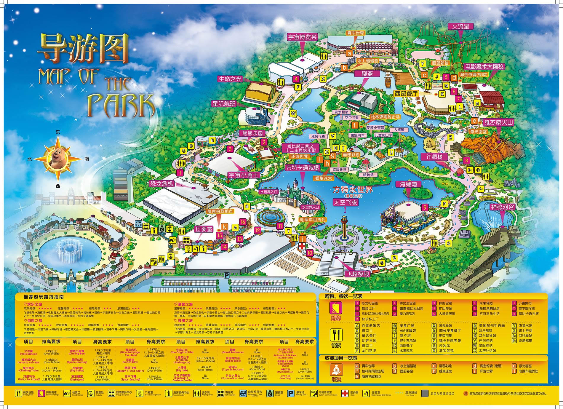 飛越極限→海螺灣→熊出沒劇場→雙層轉馬→兒童爬山車→轉轉杯→果蟲滑車→聊齋→生命之光→瘋狂成語→熊出沒脫口秀→熊出沒歷險記→恐龍危機→卡通城堡