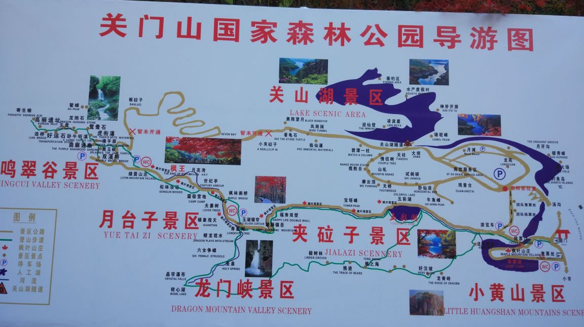森林公園內(nèi)有四大景區(qū)小黃山景區(qū)、夾砬子景區(qū)、龍門峽景區(qū)和月臺子景區(qū),共計108處景點(diǎn)。它有三道門:北門,在小市方向,雙峰對峙,中間拱橋相連;南門,在去湯溝的嶺頂,公路從中穿過,十分險要;中門,在深谷河道中,“雙扉”夾水,寬只二十余米,為興修水庫的天然門柱,有人把關(guān)門山風(fēng)景譽(yù)為“小江南”,“賽黃山”,說它有五美:山美,陡峭,俊秀,似一簇簇盆景;樹美,樹木種類繁多,特別是秋天的楓葉,冬季植根于峭壁上的蒼松,非常壯觀;水美,湯河穿過山谷,匯集小溪,飛瀑,“奪門”而出,似來自于天際;花美,天女木蘭,山杜鵑,漫山遍野;云美麗,清晨雨后,山谷中云霧繚繞,如披輕紗,分外嫵媚。歷代文人多有詩篇贊頌,許多美術(shù)工作者,經(jīng)常到這里寫生、作畫。