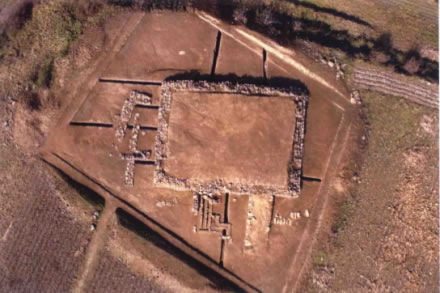 房西偏房位于正房西側(cè).南北長7.7米、東西寬3.9—5.3米,呈南寬北窄,殘高0.4米。位于正房西端,與正房臺基相連。門道位于偏房兩側(cè)中間處,南北寬1.8米、東兩進(jìn)深0.75米、高0.09米,其建筑方法基本同于正房。