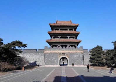 第三部分:方城、寶城、月牙城。與碑亭相對(duì)的就是隆恩門(mén),過(guò)了隆恩門(mén)就是方城了,它是昭陵的主體建筑,隆恩殿居于其中,后面是明樓,左右有配殿,四邊有角樓。過(guò)了明樓,是寶城,它下面就是葬有皇太極夫婦的地宮。