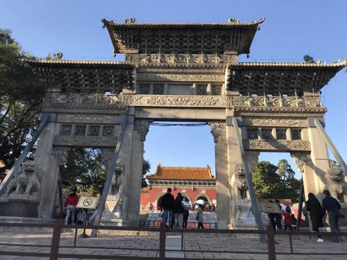 過(guò)了石橋不遠(yuǎn)處就是石牌坊,位于通往正紅門(mén)的中間路段,其上雕刻生動(dòng)形象,是清代雕刻的珍品。過(guò)了石牌坊,就是正紅門(mén)了,是陵寢的大門(mén),兩側(cè)院落東為更衣亭西為宰牲亭。