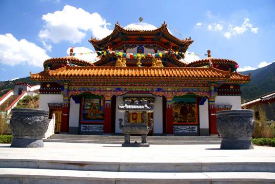 廣宗寺,其整個(gè)建筑氣勢宏偉,富麗堂皇。主要建筑有大雄寶殿、大經(jīng)堂、黃樓寺等。其中供奉西藏第六世達(dá)賴?yán)镞z體寶塔的大殿稱為“黃樓寺”。黃樓寺是一座兩層樓閣的建筑,其前部為81間,后部為49間,全部用黃、綠色琉璃瓦砌成,極為富麗。