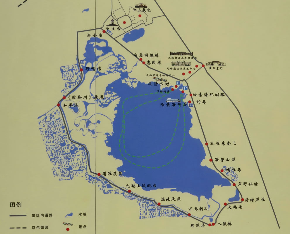 湖內(nèi)有一座水庫和一個漁場,設(shè)置游船供游客飽覽湖光山色,并可在船上品嘗鮮魚。哈素海度假村依湖而建,設(shè)有多種旅游項目和服務(wù)設(shè)施。