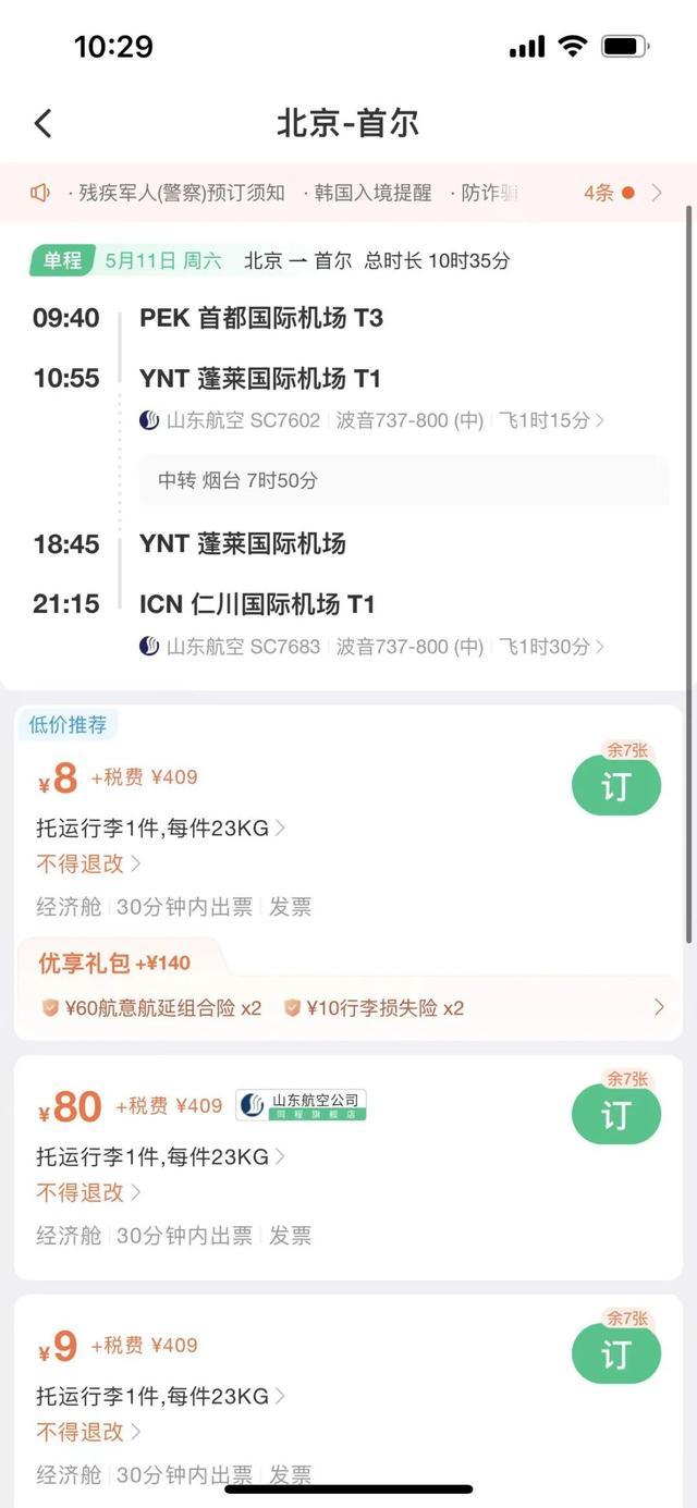 國際機票方面,中新經(jīng)緯查詢發(fā)現(xiàn),5月11日北京飛往首爾的機票(不含稅)價格低至8元,但另需409元稅費。具體來看,該航班5月11日早9點40分從北京首都機場起飛,經(jīng)煙臺蓬萊國際機場轉(zhuǎn)機,于當天晚上9點15分落地仁川國際機場。