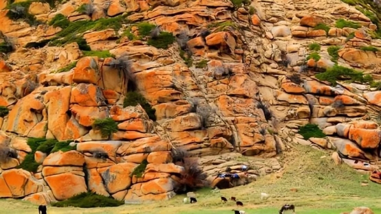 6.伊吾紅石峪(伊吾前山鄉(xiāng)北部山地中,背風(fēng)坡的山地草原,有一片罕見(jiàn)的花崗巖山體,被凜冽的北風(fēng)風(fēng)化成丘陵?duì),巨大的花崗巖則破碎成一個(gè)個(gè)的小塊,花崗巖破碎成類似于黃山飛來(lái)石的感覺(jué)。