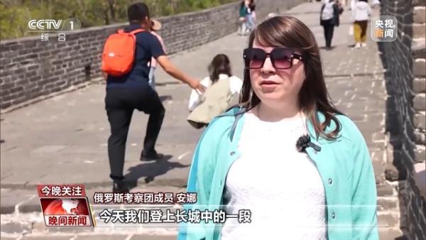 俄羅斯考察團成員 安娜:今天我們登上長城中的一段,我的感受非常棒。這段長城登起來不算太累,這點很好。
