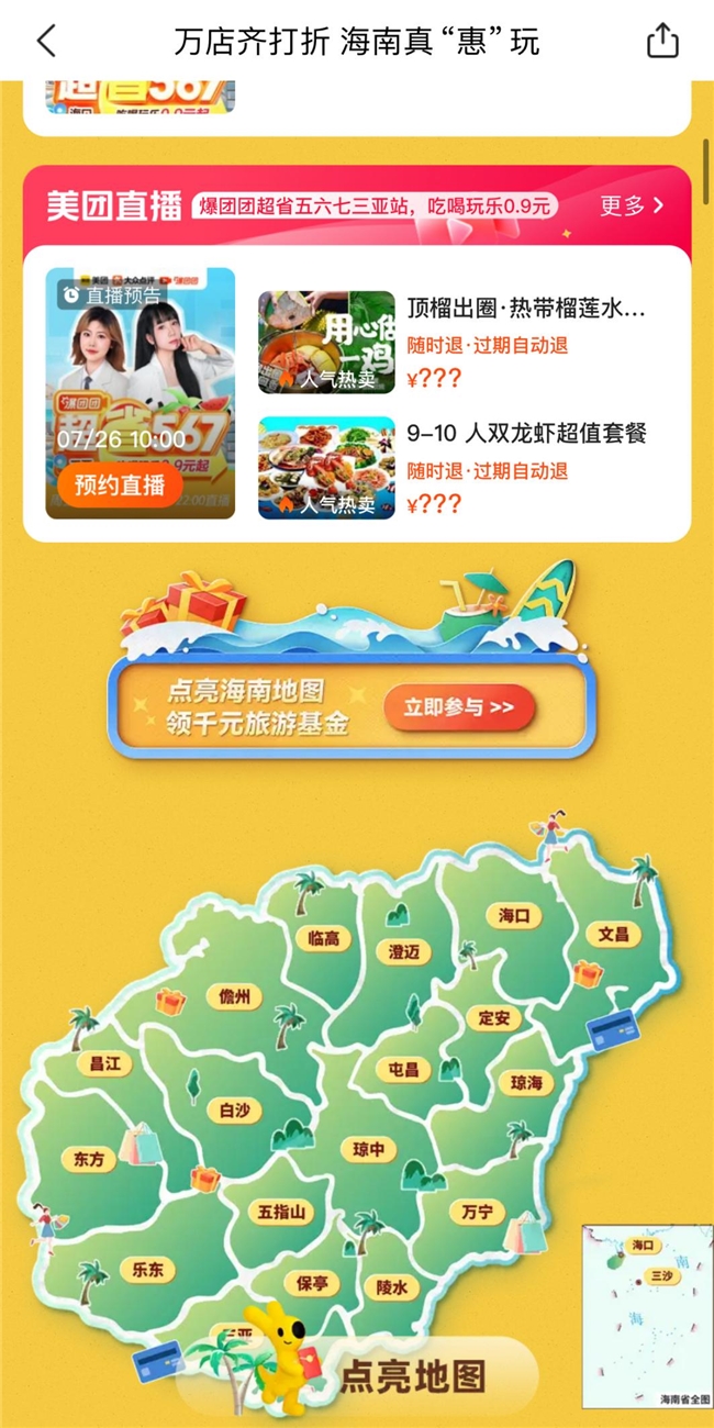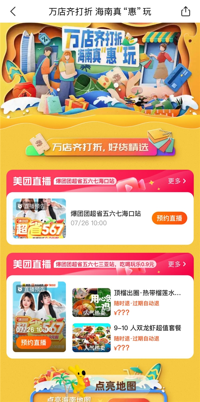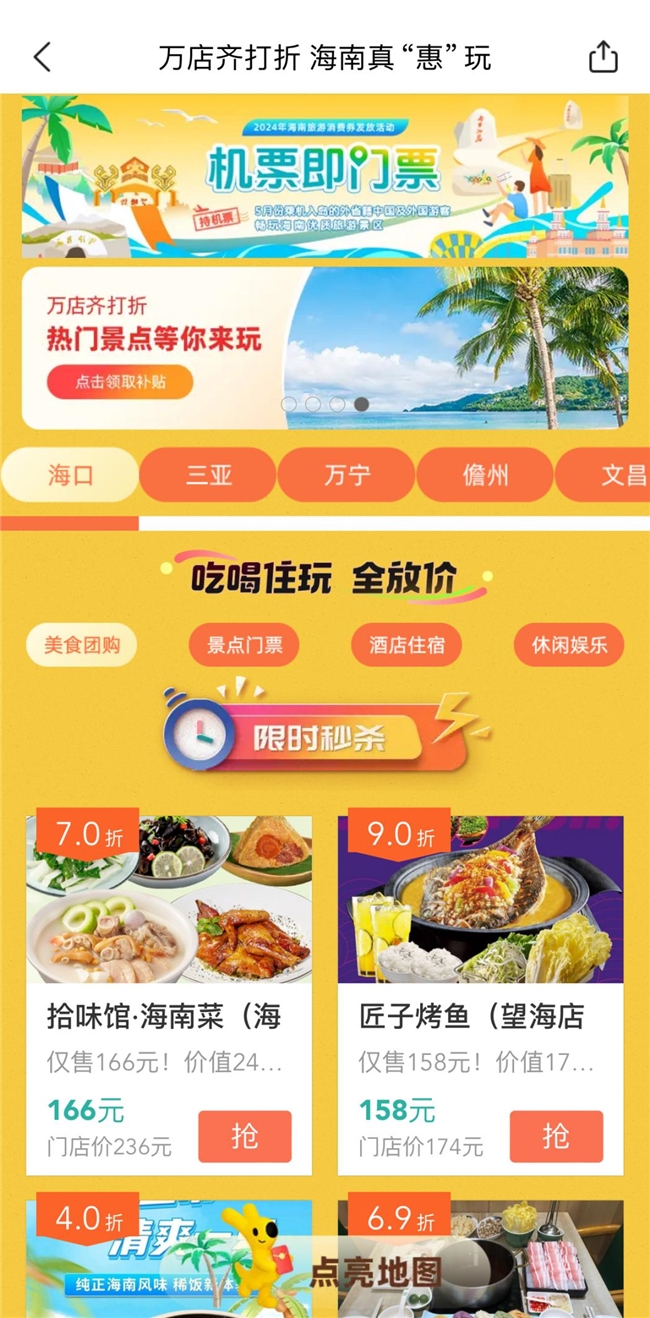 “萬店齊打折 海南真惠玩”主題營銷活動(dòng)由海南省旅游和文化廣電體育廳和美團(tuán)聯(lián)合發(fā)起,活動(dòng)覆蓋了海南省內(nèi)十八個(gè)城市,全品類商家紛紛參與,為游客們帶來了前所未有的優(yōu)惠和福利。活動(dòng)期間海南省旅文廳聯(lián)合美團(tuán)攜手一萬家商戶,為廣大消費(fèi)者和游客提供了不低于1000萬遠(yuǎn)的補(bǔ)貼折扣,用戶只要在美團(tuán)App、大眾點(diǎn)評App搜索“萬店齊打折”等字樣,即可進(jìn)入專題頁,參與各類福利活動(dòng)。