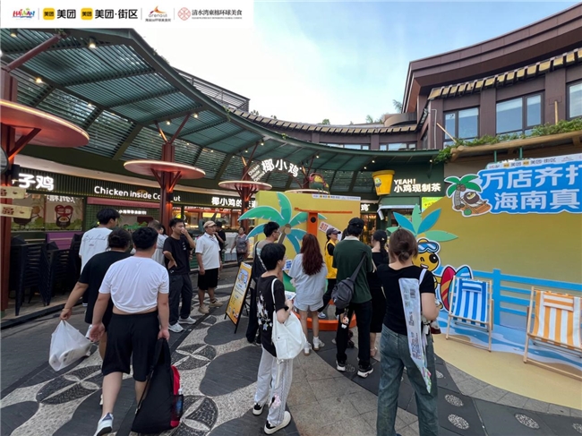 三亞海棠68環(huán)球美食街區(qū)同樣熱鬧非凡,“爆團(tuán)團(tuán)”爆品直播間活動(dòng)落地線下,各種街區(qū)爆款秒殺活動(dòng)讓游客們應(yīng)接不暇。