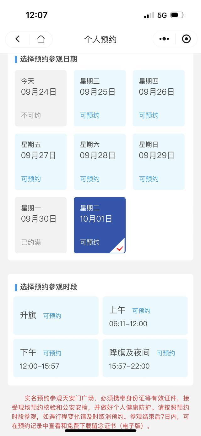 9月24日中午12時(shí),10月1日“升旗”時(shí)段的預(yù)約對外開放。不到半小時(shí),國慶節(jié)當(dāng)天“升旗”已經(jīng)全部約滿。