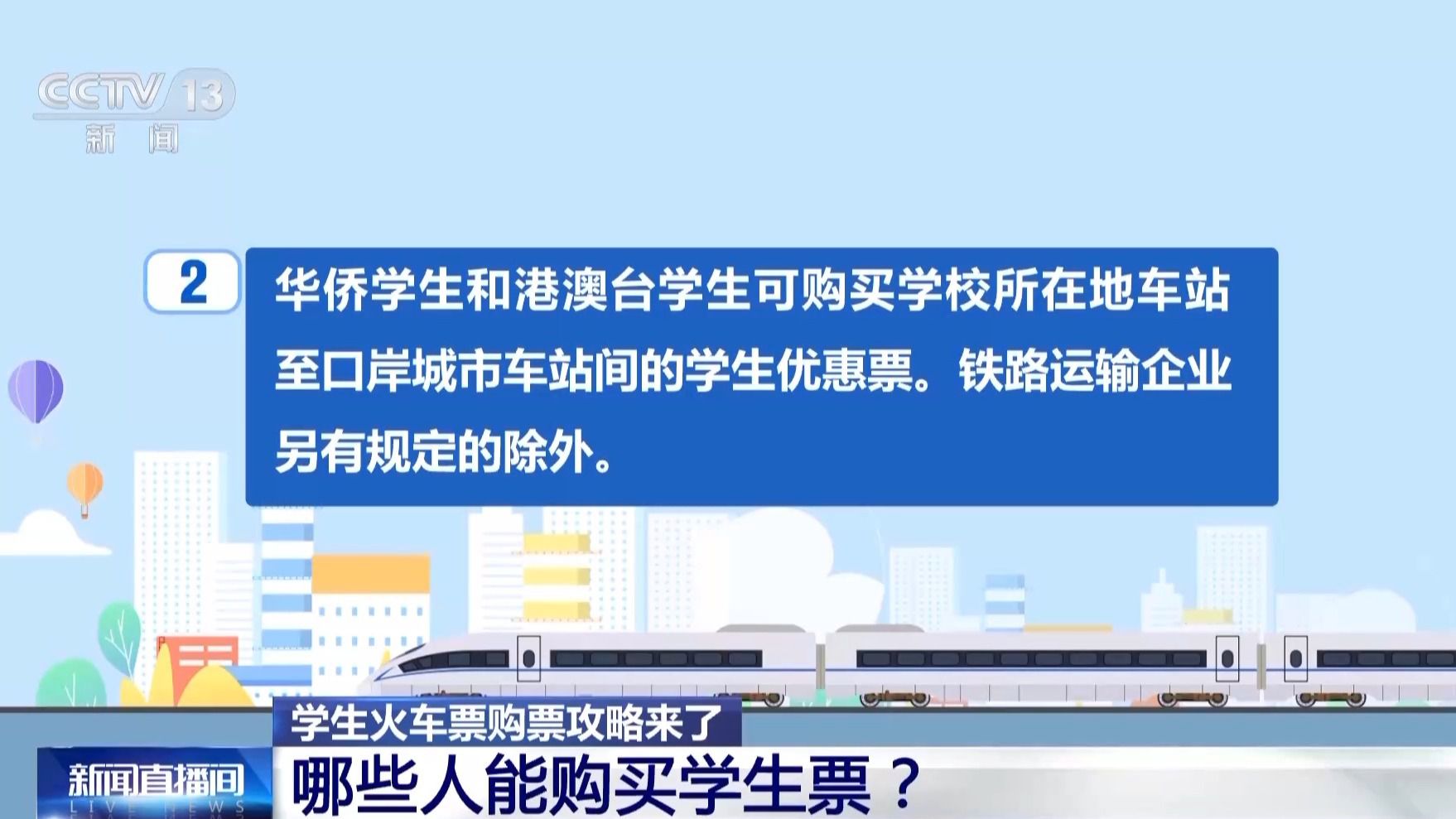 國鐵廣州局深圳北站售票值班員 劉海平:已滿14周歲的中學生需要購買學生票返鄉(xiāng),需要學校開具學籍證明,注明家庭地址,說明乘坐火車區(qū)間為某某站到某某站,加蓋學校公章,但是要去車站人工窗口辦理。(來源:央視新聞)