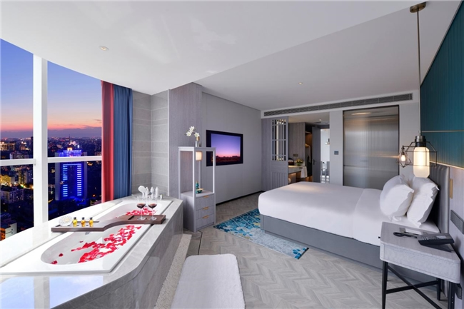 客房哲學:320間客房搭配全景落地窗設計,干濕分離設計搭配臨窗浴缸,申寶冷暖床墊實現(xiàn)“冬暖夏涼”智能溫控,高端雅蘭布草,細節(jié)處彰顯東方待客之道。