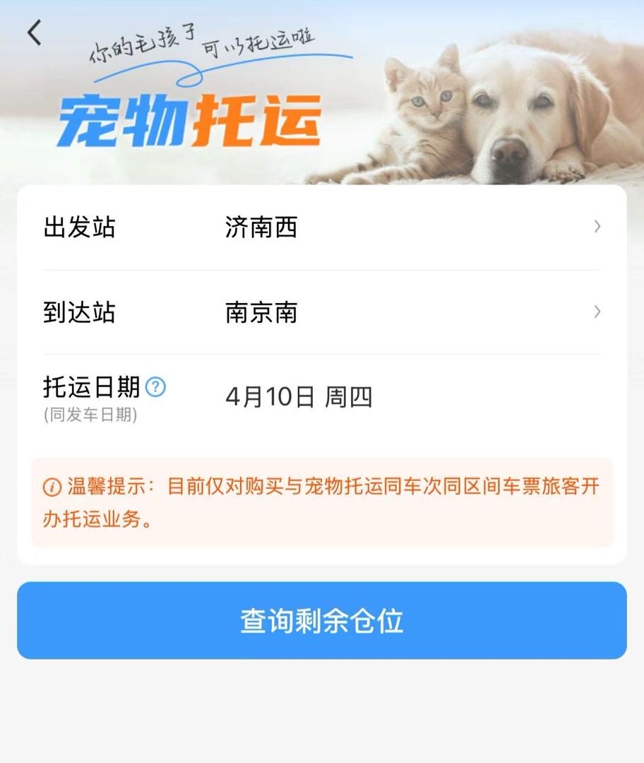 記者查詢鐵路12306App發(fā)現(xiàn),在“全部應(yīng)用”頁面“精選應(yīng)用”板塊,“寵物托運”功能已經(jīng)上線。點擊“預(yù)約下單”,填寫選擇出發(fā)站、到達(dá)站以及托運日期后,再點擊“查詢剩余倉位”,托運旅客即可查詢剩余寵物倉位,并從車票訂單或本人車票中選擇已購買的車票信息進(jìn)行關(guān)聯(lián)。