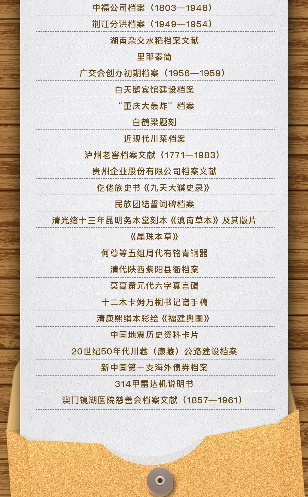 6月9日是國際檔案日。檔案,見證著歷史,傳承著文化。國家檔案局公布第六批《中國檔案文獻遺產(chǎn)名錄》,其中包括《百團大戰(zhàn)檔案》《“重慶大轟炸”檔案》《紅旗渠水利工程檔案》《何尊等五組周代有銘青銅器》《銀雀山漢墓竹簡》《廣交會創(chuàng)辦初期檔案(1956—1959)》《民族團結誓詞碑檔案》等52個項目。