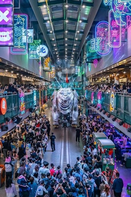 熊洞街是一個由4800平方米廢棄工業(yè)廠房改造的沉浸式IP樂園,樂園里有巨獸巡游、時尚文創(chuàng)、科技研學(xué)、特色美食等元素,用文化、科技、藝術(shù)結(jié)合的方式,打造了一個“尖叫地標”,并通過“巨熊北北”這個超級IP,把文旅和商業(yè)業(yè)態(tài)有機融合在一起。