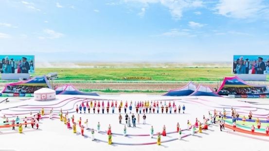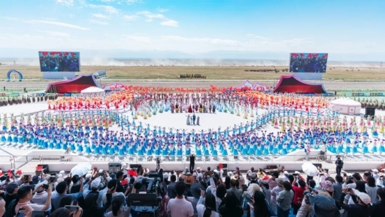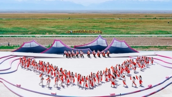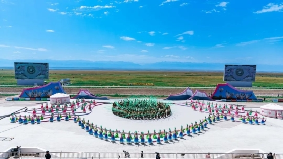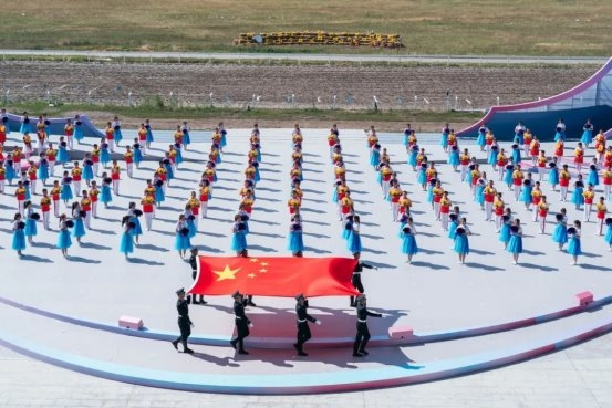 開(kāi)幕式尾聲中,全體演員深情合唱《歌唱祖國(guó)》。同時(shí),氣勢(shì)恢宏的“萬(wàn)馬奔騰”表演在喀爾坎特草原激情上演,將整場(chǎng)演出再度推向高潮。